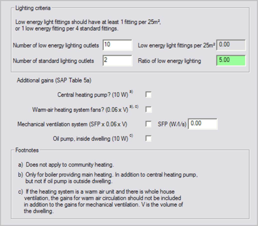 The boxes on this tab relate to box 53b of Section 5 of the SAP worksheet: Additional gains from Table 5. It also contains the input data for the low energy lighting strategy; which forms a requirement of criterion 2: limits on design flexibility see L1A for further information. For guidance on additional gains, see Section 5 of SAP 2005.