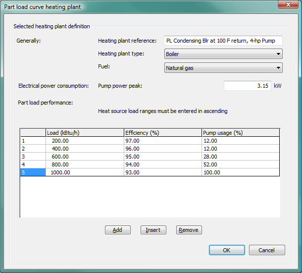 Figure 3 - 22 : Part load curve heating plant editing dialog showing illustrative inputs