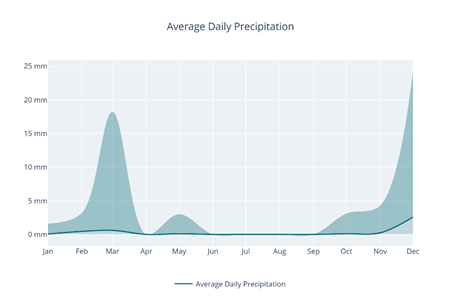 • Average Daily Precipitation: A line graph showing the mean, max, and min daily precipitation for each month