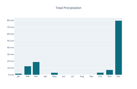 • Total Precipitation: A bar chart displaying the total accumulated precipitation per month and the total annual value (e.g., 126 mm for the example site)