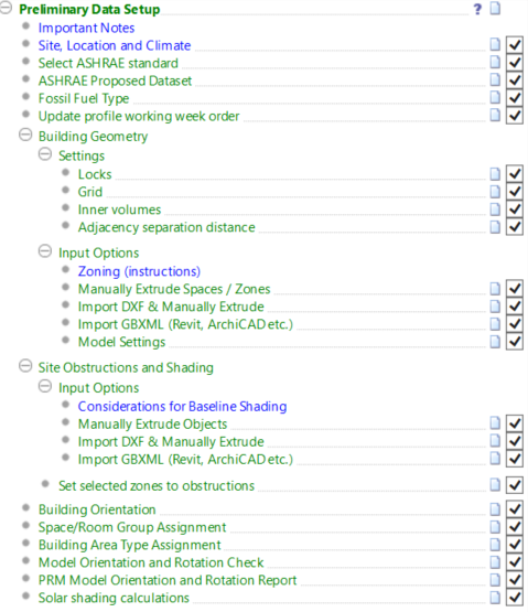 The preliminary section of the navigator contains actions that allow users to, for example, set site location and climate, import prototype data, create geometry, set building orientation and room grouping, etc.