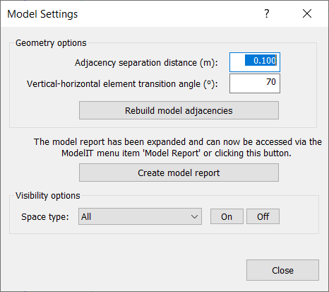 The model setting window allows the user to change the adjacency separation distance, vertical-horizontal element transition angle and perform model checks.
