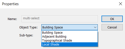 The dialog allows the room type to be changed from “Room” to a suitable shading type. There are three types of shading: