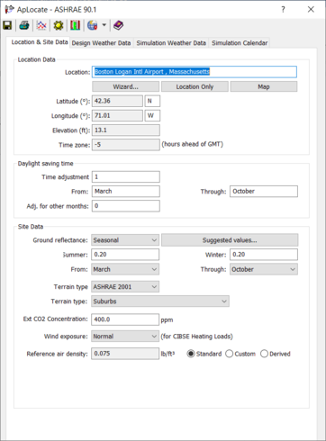 This action opens the ApLocate sub-program from which the user then specifies the global location of the building (Lat.>Lon.), external design conditions and simulation weather file. This process is driven by clicking on the ‘Selection Wizard...’ and following the necessary steps: