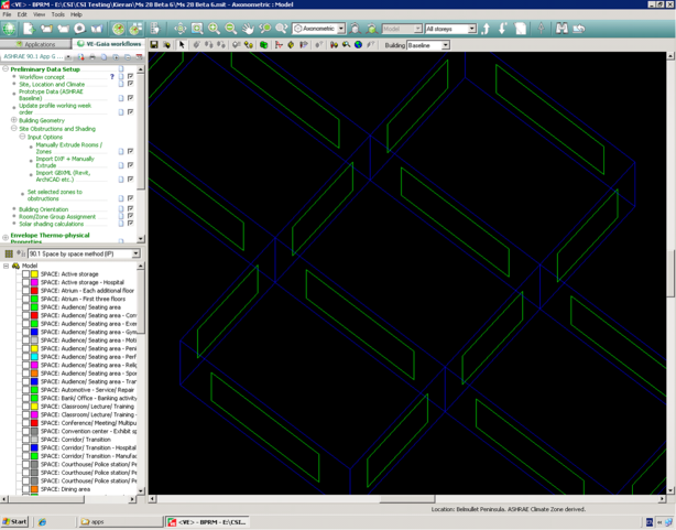 When the prototype data is imported into the working model, it contains a series of thermal room groups based on ASHRAE 90.1 ‘Building Area’ & ‘Space by Space’ methods. The ‘Building Area’ method is generally used for early stage analysis where the exact function of every zone in the building has not yet been determined. The ‘Space by Space’ method is used more often as it allows the user to assign a particular function to each zone in the building.
