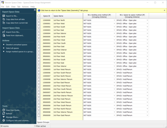 Here the user can assign building area method or space by space method groupings to groups of spaces or individual spaces. This assignment will then dictate what thermal template is assigned to these spaces later in the navigator via the ‘Space Classification’ action.
