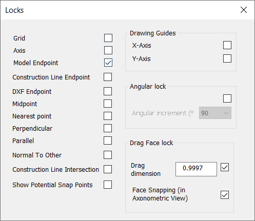Locks allow the user to snap the drawing tool to various items in the model view window such as model endpoint, midpoint, grid, etc. When creating model geometry it is useful to have the lock window open so you can switch different locks on and off depending on the particular modeling task you are trying to perform.