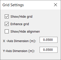 Snapping to the grid when building model geometry ensures the creation of an accurate compact model which enhances accuracy and performance later in the analysis. This option allows the distance between grid points to be set - in both the x and y direction. Checking the grid box in the locks menu will force the drawing tool to snap to the grid. In general it is recommended to use a grid separation distance of 4 inches (0.1m).