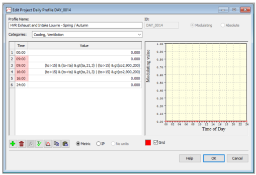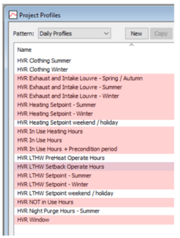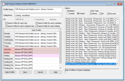 The highlighted daily profiles are the profiles that typically will need editing to change hours of use. Select a profile and amend the hours of use (highlighted) to suit the project.