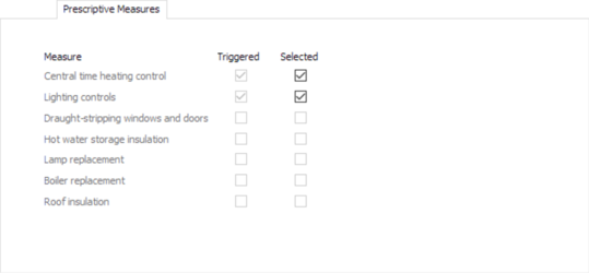 The Prescriptive Measures tab still shows which (if any) of the seven prescriptive improvement measures was identified in the original source project – these are marked as ticked in the Triggered column if they were applicable. However, as an alternative scenario is intended to identify the most relevant and economical means of improvement, it may be that the advisor wishes to prevent the automatic application of some or all of the identified trigger measures in favour of their own custom modifications.