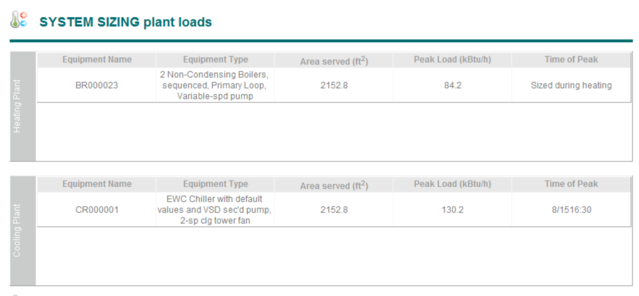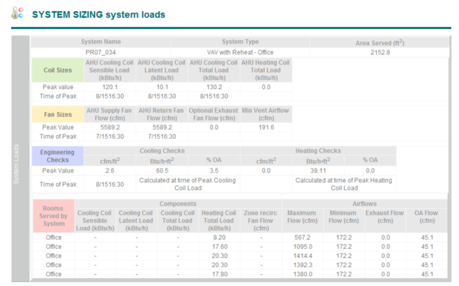 Contains detailed information relating to performance of each individual system including sizing data relating to each individual room served by the system. The information includes:
