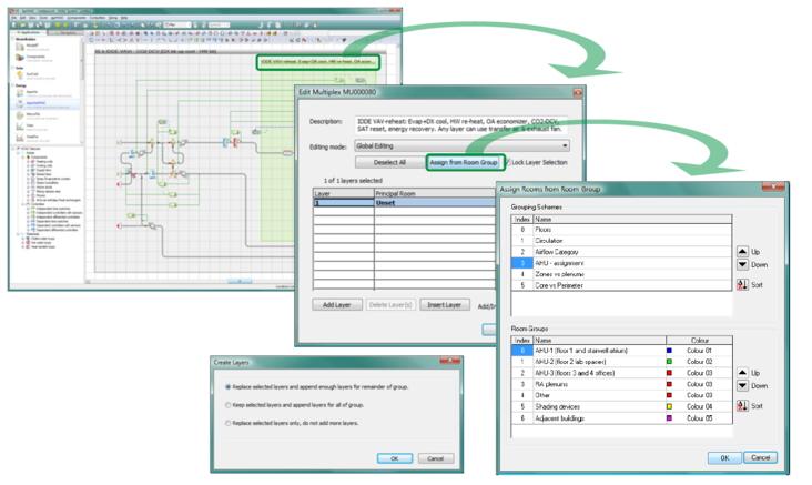 Click the Edit Multiplex toolbar button or double-click the bar at the top of the green multiplexed region of the HVAC network to open the Edit Multiplex dialog. The Assign from room group button allows groups of rooms or zones to be assigned to the selected ApacheHVAC network. This will automatically add layers as needed. A subsequent Create Layers pop-up will allow you to choose between replacing or appending the current selection(s) in the Edit Multiplex dialog.