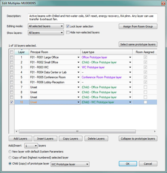 The purpose of prototype layers is to provide a means for selected layers of a multiplex to form the basis of a standard or custom system prototype. In this context a prototype layer represents a kind of template for a particular type of layer when the prototype is imported to create a system, or when a system is copied on the ApacheHVAC canvas prior to being populated with a similar range of space (e.g., in another wing of the same building). Examples of prototype layers for a hospital are ‘Office’, ‘Patient room’, ‘Short stay’, and ‘Operating theatre’. Generally, prototype layers will be most useful for large projects wherein there are many spaces in the same functional or occupancy category that will tend to share a significant number of settings within the System Parameters dialog.