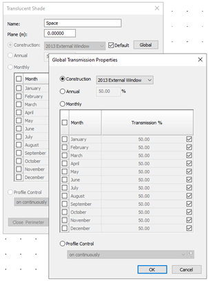 If the user clicks on the ‘Global’ button, the global transmission properties editing box pops up and allows the user to edit the global properties. Any edits will apply to all translucent shades using the global properties i.e. with the tick box engaged.