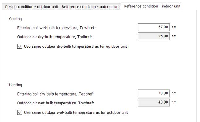 Outdoor air dry-bulb temperature (Todbref) defines the reference condition for the outdoor unit at which the reference indoor unit cooling performance is determined. By default, this value is the same as the outdoor air dry-bulb temperature for the outdoor unit at the reference condition, defined on the Reference condition – outdoor unit tab. To independently edit the outdoor air dry-bulb temperature as a reference outdoor unit condition for the reference indoor unit performance, uncheck the box labeled “Use same outdoor dry-bulb temperature as for outdoor unit”.