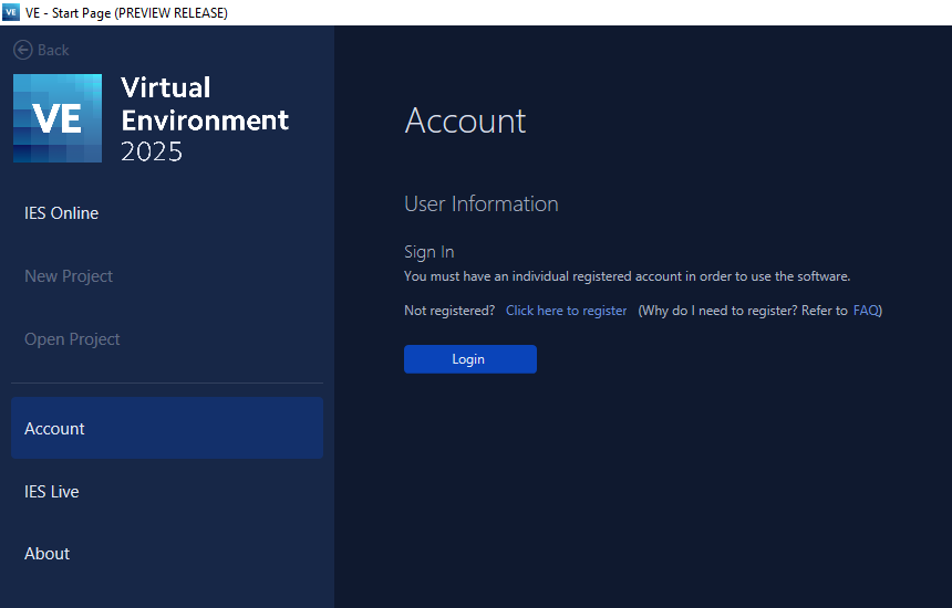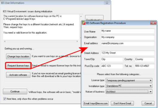 The first time you run your software, you will be presented with the IES User Information dialog that will allow you to request license keys to register the Virtual Environment for your installation.