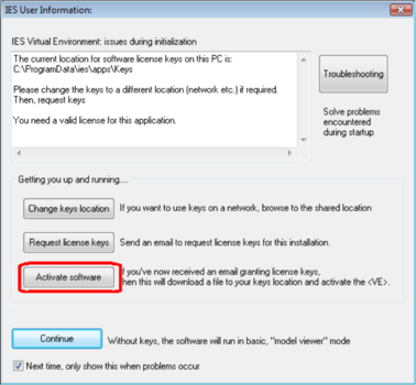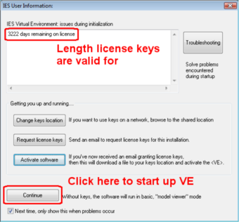 At this point the license keys have been downloaded from the IES Server to the local installation and the software can now be run. The window will now show the days remaining on the license and allow you to click Continue to launch the VE.
