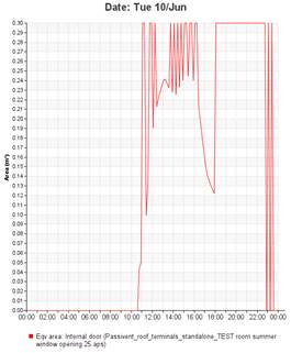 The next two images, for the same timestep, show Roof terminal performance with wind from the south (from the left of the image) firstly with a roof terminal (with low level inlets) and secondly the same roof terminal but with an opening window on the room south wall.