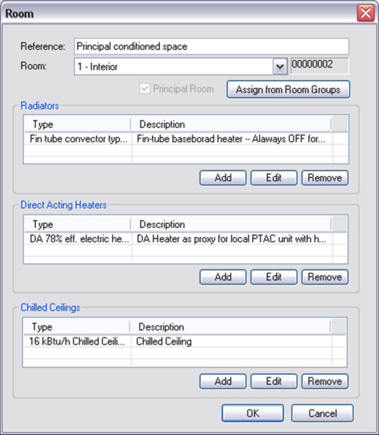 Individual instances of a Room unit Type are indicated within the Room component dialog. The type must be defined before this action will be available for a given category of room unit. A “Room” component can represent any occupied or unoccupied 3D space in the model, including normal rooms or thermal zones, façade cavities, supply plenums, and heated or cooled ceiling or floor slabs. User-defined types are effectively sitting on a shelf—they are not active until an instance of the defined type is placed within a Room component. Each time a room unit type is placed within a room component, an additional instance of that type is created. Room unit controllers are thus specific separate instances of a particular room unit type. Note that no more than one room unit instance per category (e.g., Radiators) may be placed within a given room component; however, for Radiators and Chilled ceilings, it is possible via their respective controller dialogs to specify multiple copies of the unit for any given instance. Thus, it is possible to have many identical radiators or chilled ceilings in particular model space using a single instance of the type.