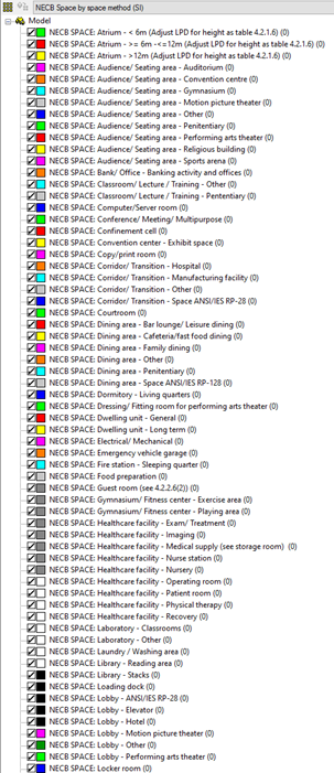 In the space by space groups some group names include an annotation to remind the user to make manual adjustments to the prototype thermal room data relating to, for example LPD due to atrium height or to referring to the containing space for lighting controls etc.