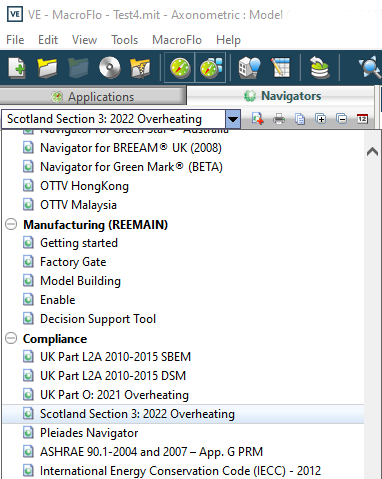 The Scotland Section 3: 2022 Overheating Analysis Navigator is accessed via the Navigators tab > Compliance section.