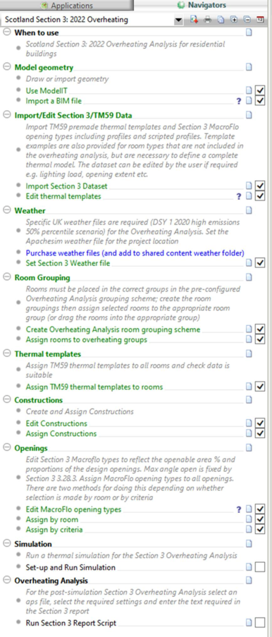 The Scotland Section 3: 2022 Overheating Analysis Navigator provides a workflow for users to follow but users are not bound to the workflow and can use it as required to meet their own needs, for example if preferred the user can use new project > TM59 template option.