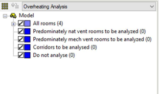 Select spaces(s) and use the Assign rooms Navigator option or drag rooms from the All-rooms group to the appropriate analysis room group in the browser pane with the grouping combo-box set to Overheating analysis (as above).