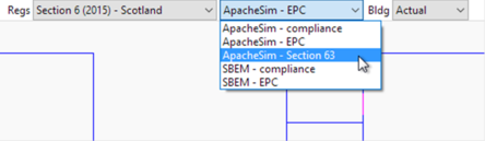 As an associated assessment to the ApacheSim EPC for Section 6 (2015) Scotland, you use the VE Compliance module to perform a Section 63 assessment and generate an Action Plan. You can access Section 63 by selecting Section 6 (2015) - Scotland from the Regulations dropdown on the toolbar, and then selecting ApacheSim - Section 63 from the Simulation Mode dropdown: