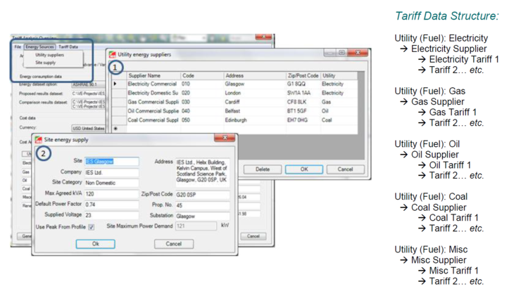 Variable tariff rates allow tariffs to be set based on demand, time of day, peak values, accumulated use and more. The Tariff analysis dialog changes to show Supplier and Tariff Description in the Cost Analysis section (1).