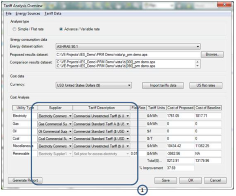 Tariff analysis feature gives flexibility to review any previously simulated results file and to apply either a Simple (flat rate) or Advance (variable rate) rate tariff to the aggregated Fuel (Utility) usage or the generation of renewable electricity.