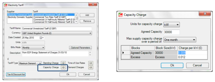 Capacity Charge tariffs usually allot an agreed maximum capacity, should this agreed capacity be exceeded over the negotiated period an additional penalty per kW will be charged over the agreed capacity. Typically these charges are assigned over and above the standard charges (Time of Use Rates) as a excess penalty. Be vigilant to not double-up the charges – carefully study the Utility providers terms and conditions to ensure that the excess charge is matched correctly.