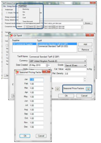 Variable tariff rates allow tariffs to be set based on demand, time of day, peak values, accumulated use and more. The Tariff analysis dialog changes to show Supplier and Tariff Description in the Cost Analysis section (1).