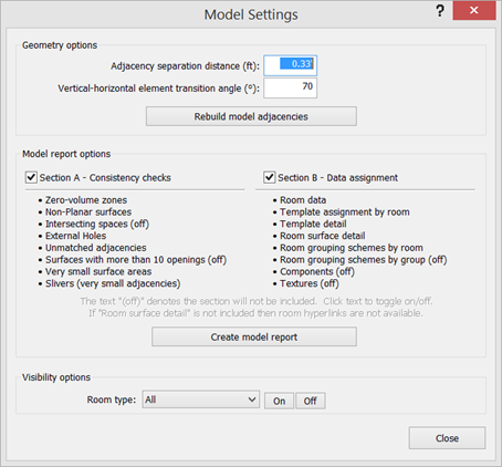 When a model is created by placing spaces side by side (or on top) the relationship between adjacent (or overlapping) surfaces is detected. The ''Adjacency Separation distance'' is the threshold at which the detection occurs, i.e. if the surfaces are closer than this distance they are flagged as adjacent otherwise not. This value can be changed in the ''Model Settings'' pop-up window (''Settings''->''Model'' menu). After this value has been changed the ''rebuild'' command should be invoked.