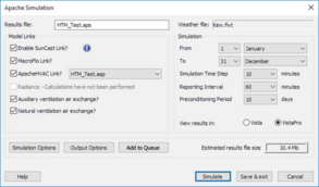 In order to simulate HTM in your model using Apache, you must apply the HTM assignments to an ApacheHVAC system file (.asp) – this could be an existing HVAC system file that you already have set up for your building, or the VE can create you a new file that will represent just the HTM functionality. You then include the relevant .asp file in the simulation by selecting it as the active ApacheHVAC Link? file.