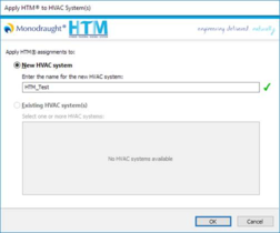 To apply your HTM assignments to an ApacheHVAC file, click on the Apply HTM® assignments to ApacheHVAC system files action in the navigator – the Apply HTM® to HVAC System(s) will appear: