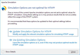 You can use the Show Details button at the bottom-left to display information on which setting(s) are not at the expected value. If you would like the settings to be automatically updated to be optimal for simulating HTM, you can click the Update Simulation Options for HTM® button – otherwise, click the Use Existing Simulation Options button to continue with your current simulation options.
