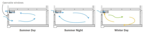 Monodraught HVR system mounted on the facade (can be ducted to provide ventilation to the rear of deep plan rooms) to assist with single sided ventilation using openable windows. System automatically provides secure night-time cooling through natural ventilation opening or fan assisted if required. Winter ventilation automatically modulates dampers to mix re-circulated air, external air via the heat exchanger with external air to ensure optimum ventilation temperatures.