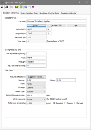 This command opens ApLocate in NECB mode from which the user then specifies the global location of the building (Lat.>Lon.), external design conditions and allows the selection of a suitable simulation weather file from the weather files installed on the PC. ApLocate in NECB mode loads in the required design weather data from NECB table C-1. Users should not set location outside the NECB navigator or on the new project wizard page.