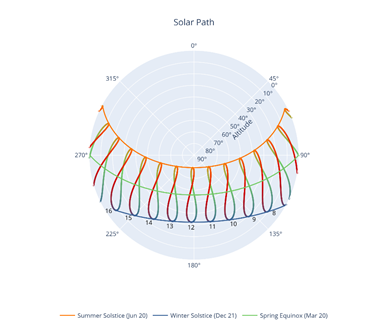 • Solar Path: An analemma chart visualizing the sun's position (altitude and azimuth) throughout the year, highlighting the Summer/Winter Solstices and Spring Equinox