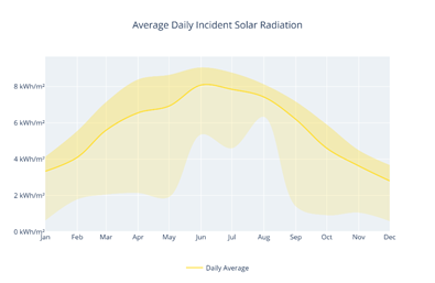 • Average Daily Incident Solar Radiation: A plot showing the total solar energy reaching a specific location over a 24-hour period, identifying the brightest and darkest months