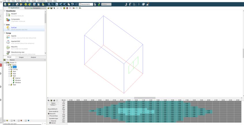 When a room is selected, go down to any surface and view the insolation on internal or external surfaces as required