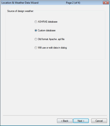 Once Custom database is chosen, click Next > and on the following dialog, shown below, choose Select and select from the list of custom databases to choose the design weather.