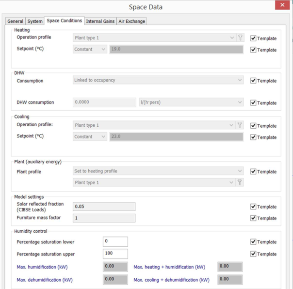 This tab is displayed for rooms and plenums. It contains space attributes relating to space conditioning and two parameters relating to space modelling.
