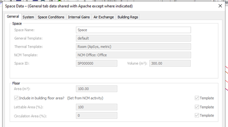 The General tab includes the NCM template applied to the room predetermined by the Actual building selection. The applied NCM template overrides the room parameters based on the NCM activities database (as discussed above). This selection is in keeping with the Building and Room settings applied (refer to earlier sections).