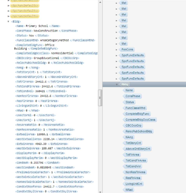Additionally, full reports of all building inputs for each analysis model are echoed in the AnalysisResults XML file. The organization of the input data follows the Standards Data Dictionary (SDD) data model structure. Figure 6 illustrates the XML format of the Building data.