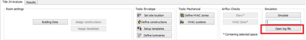 A log file is associated with every IES VE project. It is located in the same folder as the project .mit file and is named: <project name>.log. The log file contains a history of when the project was opened and saved, when an analysis was performed, and any errors or warnings that occurred during an analysis. To view or edit a log file, in the Title 24 Analysis tab at the bottom of the screen, click the “Open log file” button (Figure 7).