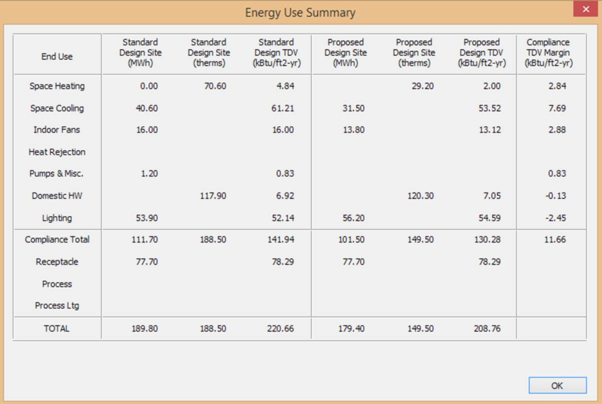 At the completion of the analysis, the Basic Output Results screen (Figure 1) shows the energy use summary for the building and each end-use in terms of Site energy (by fuel type) and kTDV. This output screen also reports a summary of unmet load hours, a compliance margin for each end-use and the whole building, and an indication of whether the building passes or fails the compliance analysis.