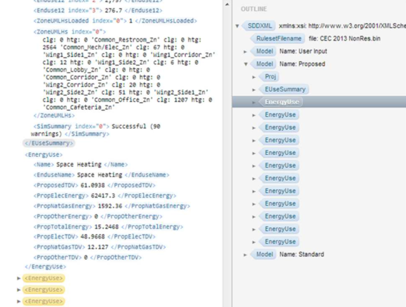 Figure 5 shows an example of the analysis output results for the Proposed Model. The EUseSummary tag contains annual TDV energy results for each end use (which are reported in the Basic Output Results screen shown in Figure 1). The EnergyUse tag shows a detailed energy consumption summary for each building end-use. The data includes total TDV energy consumption, total site energy consumption, and a breakdown of TDV and site energy by each fuel type for that end use.