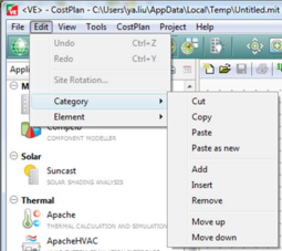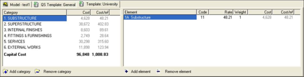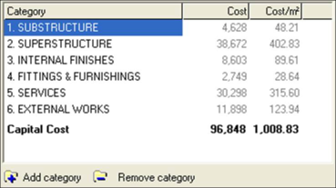 Note that the elemental costs are grouped into a number of Categories. Categories can be added, modified or deleted.