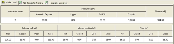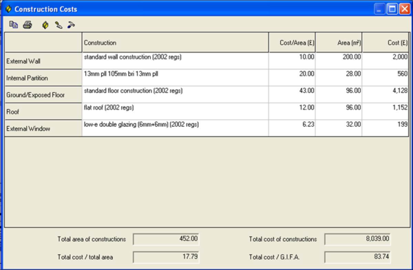 The following browser at the bottom of the main window allows the user to view and edit the cost data. Tabs along the top allow the user to view current project information including: number of zones, floor area, and areas of external wall, internal wall and roof in square metres (or feet).